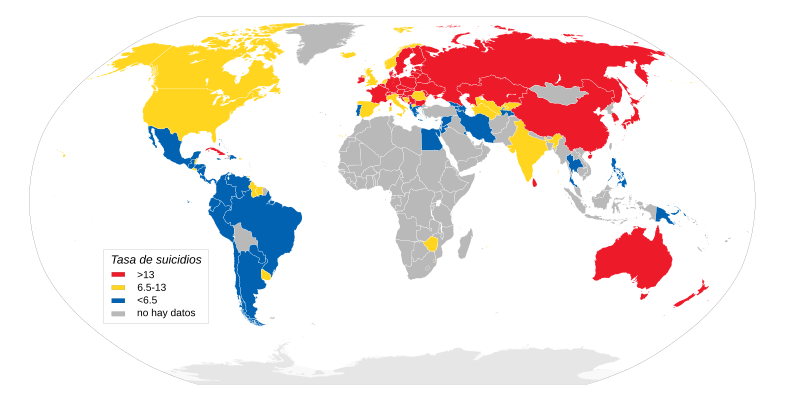 Hola! Les pongo este mapa de las tasas de suicidios que tomé de wikipedia, en donde los países en azul son los que tienen menos suicidios, los amarillos los de niveles medios y los rojos los más suicidas. Les pregunto, ¿Creen que la religión o nivel de religiosidad de un país influye en esto? Miren los países de América Latina que casi todos son azules y también Filipinas y Portugal (los cuales todos son países católicos), pero tendrá relación alguna todo esto? Quiero oír sus opiniones, gracias!!!
