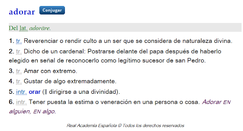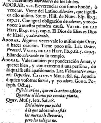 también se puede apreciar al comparar la definición de esta palabra en varios diccionarios a lo largo de los años. Comencemos examinando las acepciones que ofrece de la palabra latina adorāre (de la que deriva la española adorar) el Diccionario por raíces del latín y de las voces derivadas del Dr. Santiago Segura Munguía (Universidad de Deusto, Bilbao, 2006), probablemente el mejor diccionario académico latín-castellano disponible: