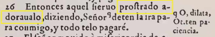 En esta parábola del Evangelio según Mateo, Casiodoro de Reina usó el verbo adorar para referirse al gesto de reverencia y súplica de un siervo ante su rey. Por muchos años las sucesivas revisiones de la Biblia del Oso continuaron usando adorar en este versículo. Así, veamos como vierte Mateo 18:26 una edición de Reina-Valera publicada por las Sociedades Bíblicas Unidas en una fecha tan reciente como 1953: