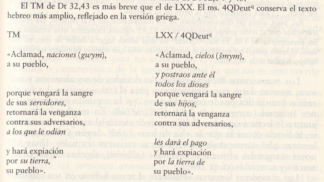 Texto Masorético hebreo (TM) o la LXX; uno de los manuscritos hebreos de Qumrán (4QDeutq) apoya la lectura de LXX. Así muestra estas diferencias el libro