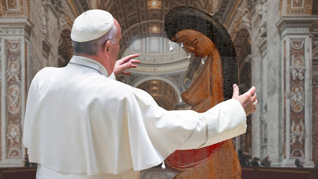 La primera forma en que este llamamiento se muestra como un simple ejemplo de la fácil oposición que los "conservadores" han planteado desde que se anunció el Consejo Vaticano en 1959 --- hace 60 años --- pero, en su intento de lanzar los hechos como meros ejemplos de graves pecados personales, a fin de desviar cualquier afirmación de que tales acciones provocarían una deserción tanto de la fe como de la Iglesia misma. Adorar ídolos y entronizarlos en el altar de San Pedro, cerca del lugar donde San Pedro se negó específicamente a hacer esas cosas, se considera un pecado realmente malo por el que el pobre pecador tiene que reparar, como lo haría con cualquier otro. otro pecado. La conmoción de un hombre que reclama el trono de San Pedro negando en sus acciones la esencia misma de la verdadera religión, ya sea la de la Iglesia o la de los judíos del Antiguo Testamento,