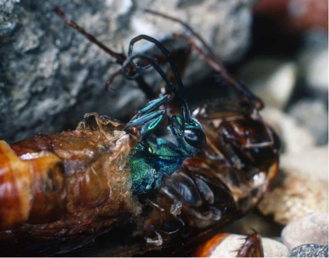 Una avispa joya recién nacida emerge del cadáver de su huésped, la cucaracha americana.