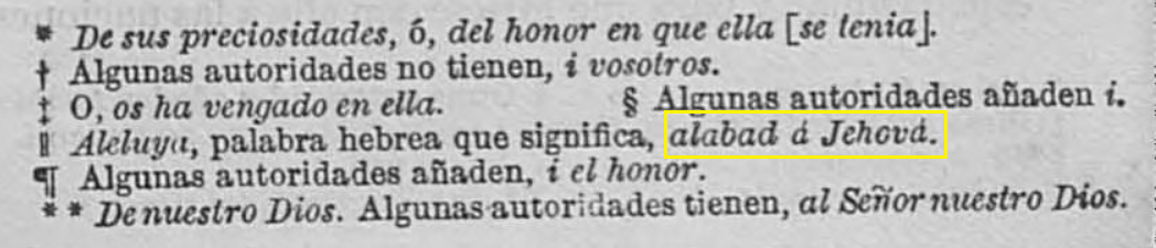 nota a Revelación 19:1 explicando el significado de la palabra Aleluya, se usa el nombre Jehová para referirse al Dios Verdadero de la Biblia: