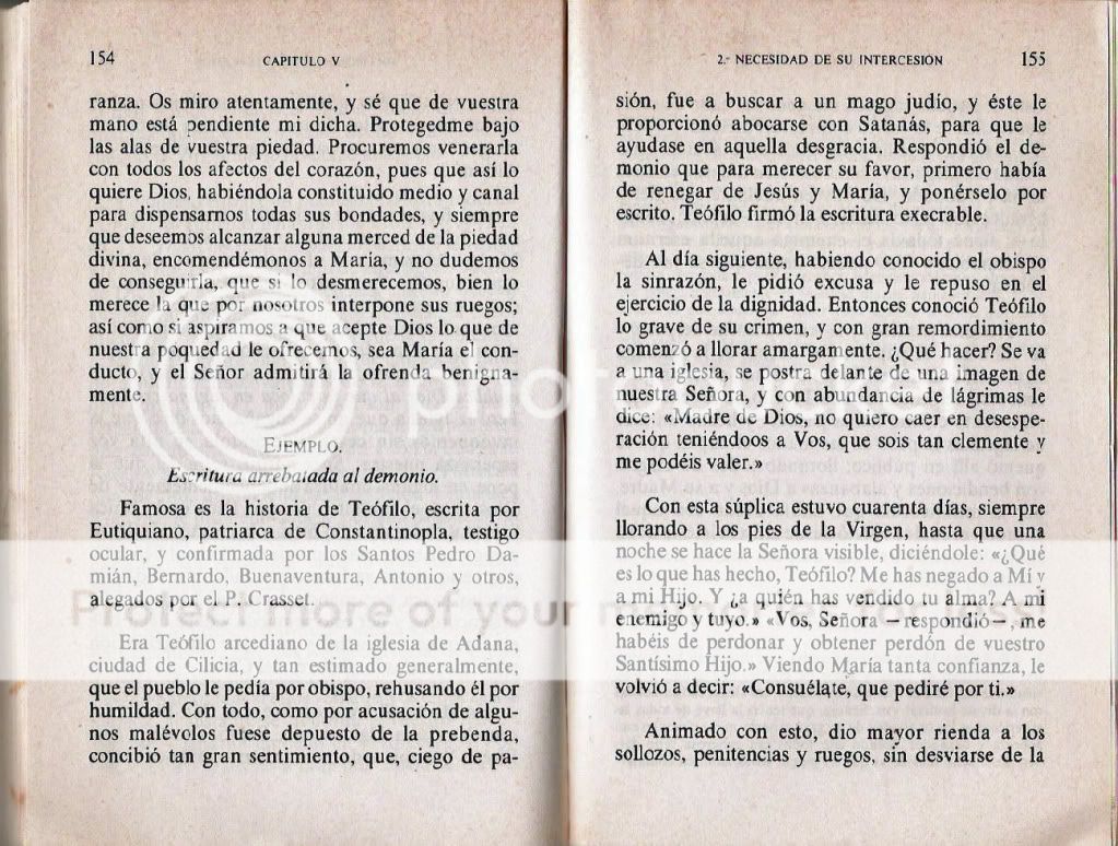 Si Vos me protegéis, nada temo. No temo al demonio, porque sois mucho mas poderosa que todo el infierno; no a mis pecados, porque me podéis alcanzar el perdón con solo una palabra que digáis, ni aun temo la cólera del Juez airado, porque una suplica vuestra basta para aplacarle. En suma: valiendome de Vos, todo lo espero, porque todo lo podéis, Madre de misericordia,