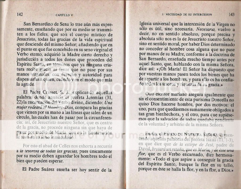 De todo lo dicho se infiere claramente que cuando estos Santos y Doctores enseñan que todas las gracias del Cielo vienen por sus manos, no han querido decir solamente que sea porque de Ella hemos recibido a Jesucristo, fuente de todo bien, sino porque, ademas, quiere Dios que cuantos favores y auxilios se han dispensado después a los hombres, y se dispensaran hasta el fin del mundo por los méritos de Jesucristo, todos hayan de ser debidos a la intercesión de su Madre Santísima.
