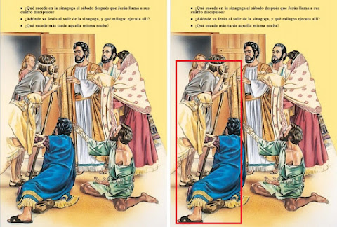 Los artistas de la Watchtower (brazo editorial y de publicidad de los Testigos de Jehová) han estado insertando en secreto medias caras de personajes demoníacos en las ilustraciones. Estos rostros son “watchers” (vigilantes o guardianes) y representan la omnipresencia de Satanás; los “ojos y oídos” del diablo. Estos rostros pueden descubrirse con la ayuda de un espejo.