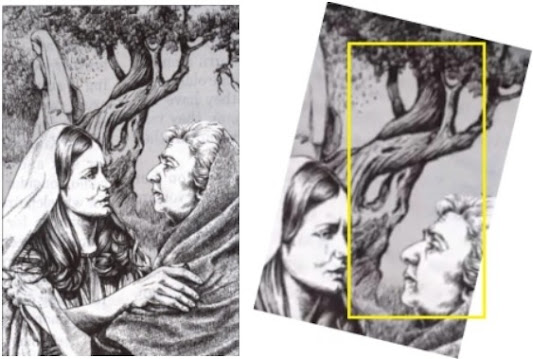 Para revelar esta imagen oculta lo único que se ha hecho es tomar la pieza de arte, tal como se halla en la revista, y colocar un espejo en un lugar específico dentro de la misma, creando así una nueva imagen compuesta de la mitad de la pintura vista hacia adelante y hacia atrás al mismo tiempo.